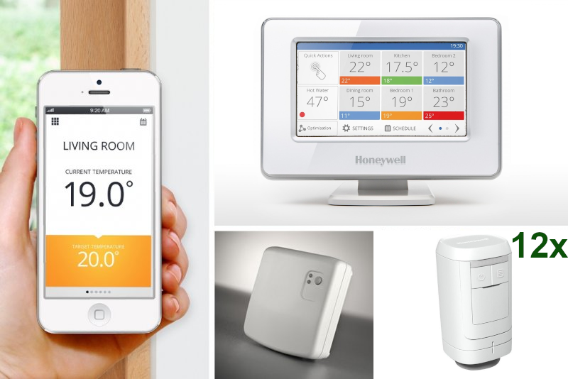 Honeywell Evohome - WiFi sada L-12 pro chytrou regulaci vytápění rodinných domů, bytů a kanceláří. Sada L-12 obsahuje 12 bezdrátové termohlavice a je tak výhodným řešením pro byty. Více informací