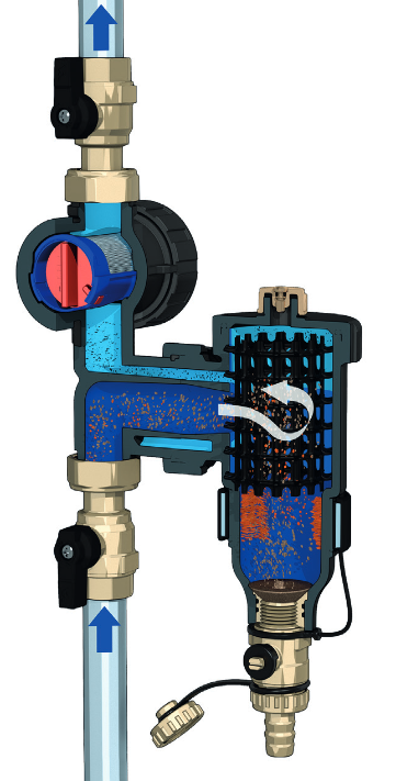 Stáhnout PDFVysoce účinný odkalovač s filtrem a magnetickým kroužkem odstraňuje z protékajícího média všechny nečistoty a částečky rzi. Celé zařízení sestává z odkalovače s vnějším magnetickým prstencem, který zachytává částečky rzi a další nečistosty, a z filtru s jemným sítkem, který zbaví médium posledních nechtěných zbytků nečistot. Odkalovač lze snadno vyčistit i za provozu, anižby se musel demontovat filtr. Dodáváno rovnou se dvěma kulovými uzavíracími ventily.