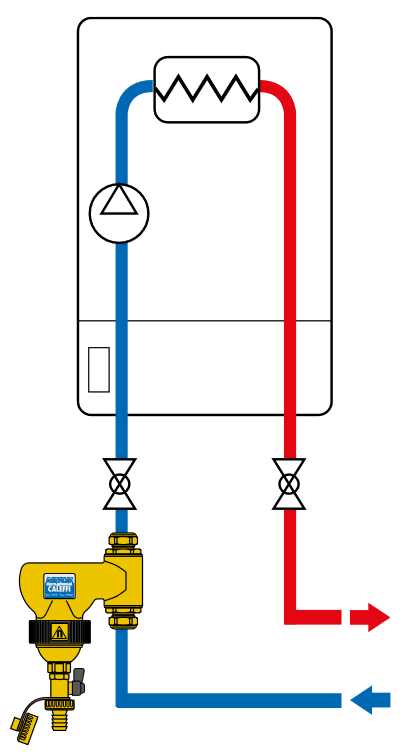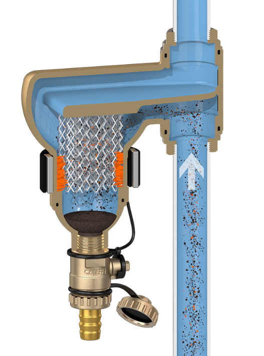 Odkalovač s magnetickým kroužkem Caleffi DIRTMAG 546805 k odstranění nečistot a částeček rzi z klimatizační soustavy pro svislá potrubí. Více informací