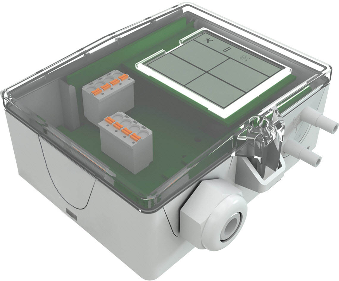 Diferenciální tlakový snímač Thermokon DPA2500+ LCD VV MultiRange pro vzduch, měřicí rozsah až ±2500 Pa, výstup 0–10 V. Více informací