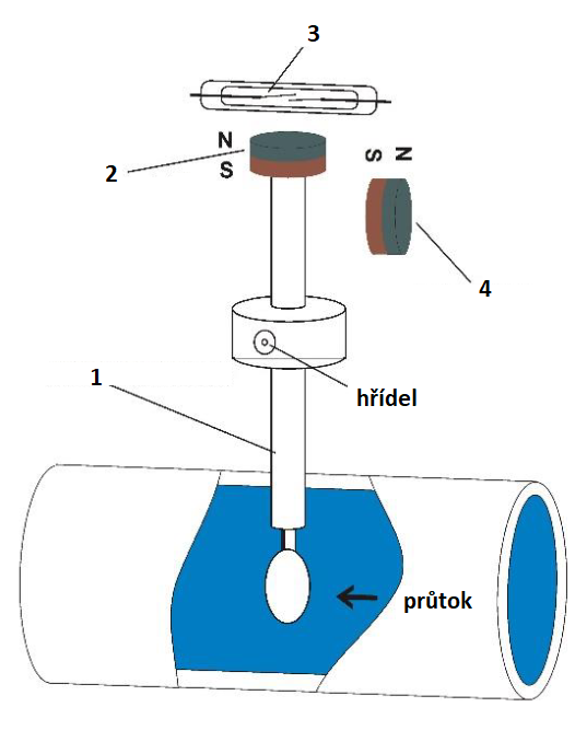 Proud kapaliny potrubím způsobí pohyb lopatkového systému (1) spínače. Na konci lopatkového systému je umístěn stálý magnet (2), který se při pohybu systému přiblíží k jazýčkovému relé (3). Vratnou sílu tvoří druhý magnet (4) s opačnou polaritou. Dle zvoleného typu se kontakt sepne či rozepne. Jakmile se proud kapaliny zastaví, lopatka se vrátí do původní polohy a relé se opět buď rozepne, nebo sepne.