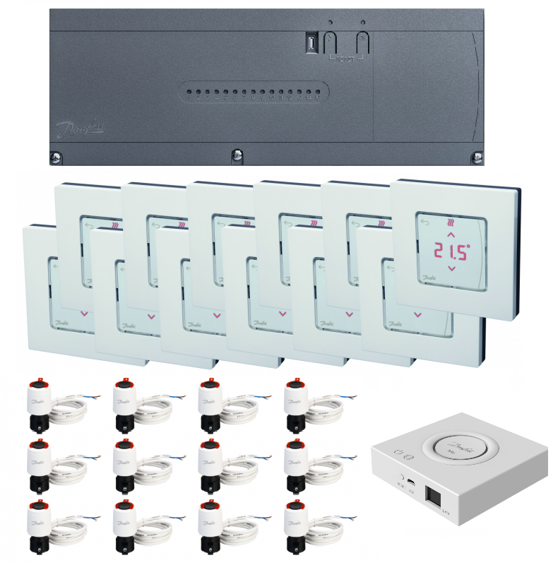 Sada Danfoss Icon pro regulaci podlahového vytápění s drátovým propojením na omítku. Obsahuje řídící regulátor, 12 termostatů, 12 termoelektrických pohonů a Ally Gateway. Více informací