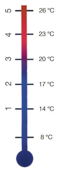 Teplota na hlavici je značena 5 čísly. Teplotní rozdíl mezi jednotlivými čísly odpovídá 3 °C.