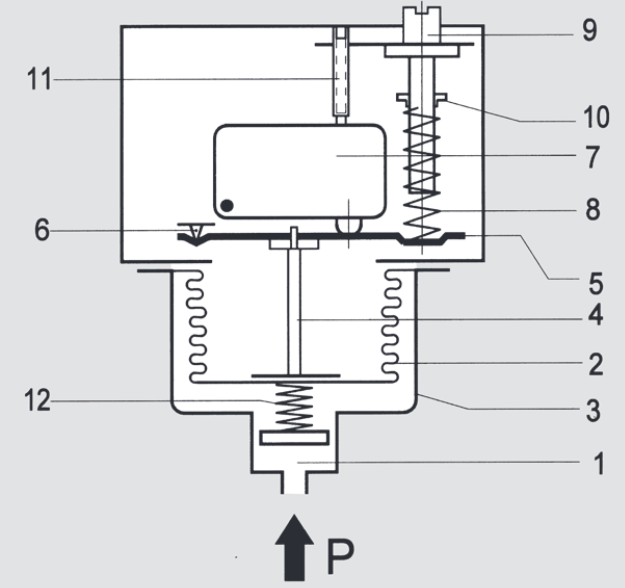 Tlak procházející spínačem skrze připojení (1) působí na měřící měchy (2). Při jeho změně dojde k pohybu měchů, jejich pohyb je přenášen skrze přítlačný čep (4) na spojovací můstek (5). Při stoupajícím tlaku můstek tlačí na spínací prvek (7) a ovládá ho. Protiváhu zajišťuje pružina (8). Pomocí šroubu (11) lze kalibrovat spínací prvek. Protitlaková pružina (12) je určena pro stabilní spínání i při nízké nastavené hodnotě.
