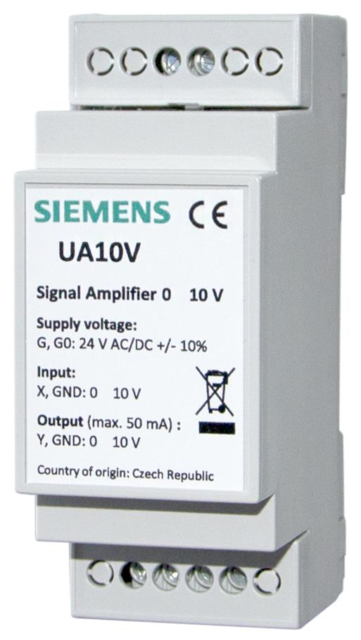 Stáhnout PDFZesilovač řídicího signálu Siemens UA 0-10 V (UA10V) slouží k zesílení a distribuci řídicího signálu 0-10 V v aplikacích měření a regulace. Je vhodný zejména pro ovládání více fan-coilových jednotek s ECM ventilátory pomocí jednoho regulátoru. Zařízení je určeno pro napájení 24 V AC/DC a poskytuje výstupní signál 0-10 V s maximálním proudem 50 mA. Napájení a signál 0-10 V jsou vzájemně galvanicky odděleny, což přispívá k bezpečnému a spolehlivému provozu v řídicích obvodech. Je vhodné pro použití s regulátory Siemens řad RDG2.., RDG16.. a RDF660..